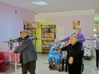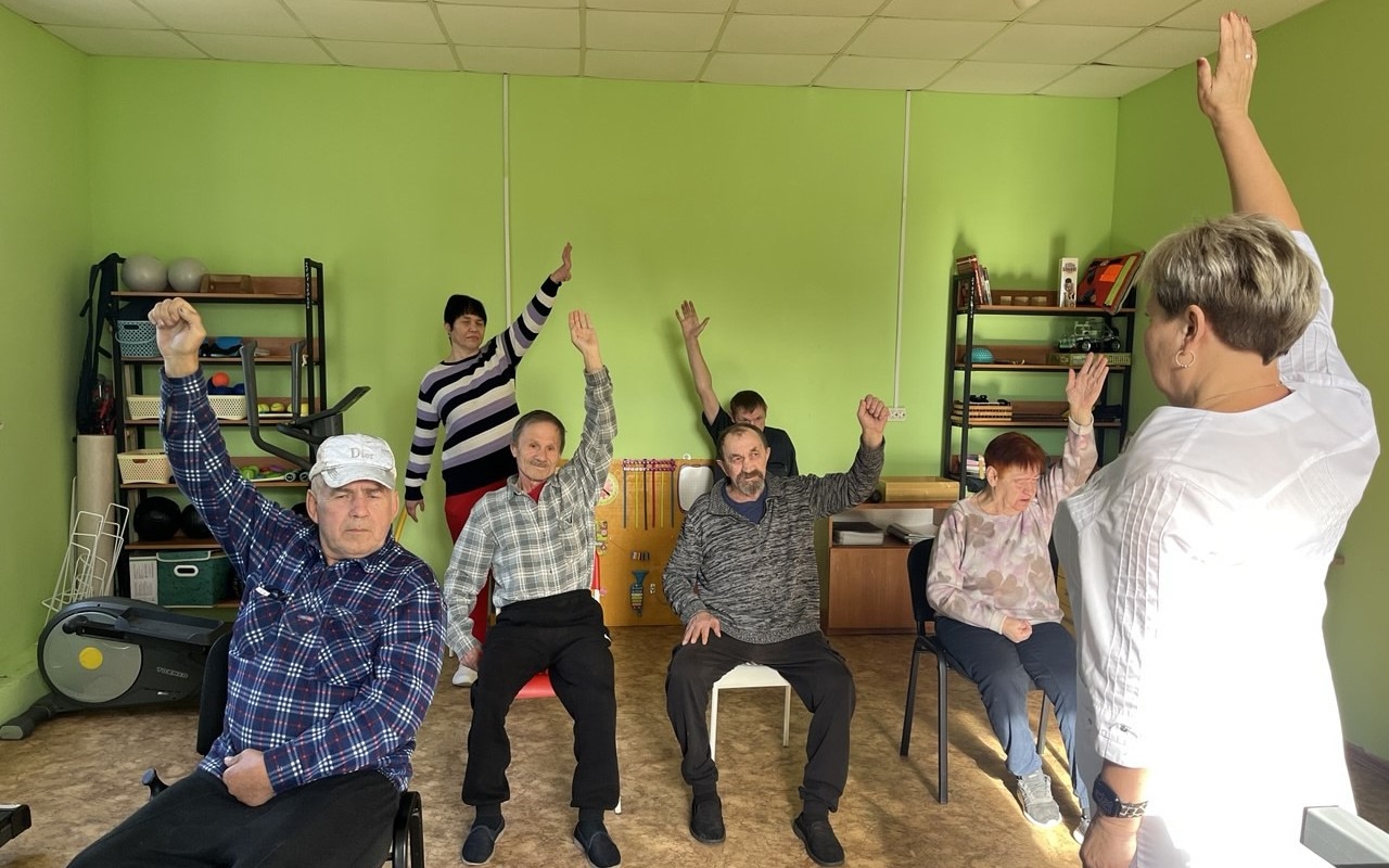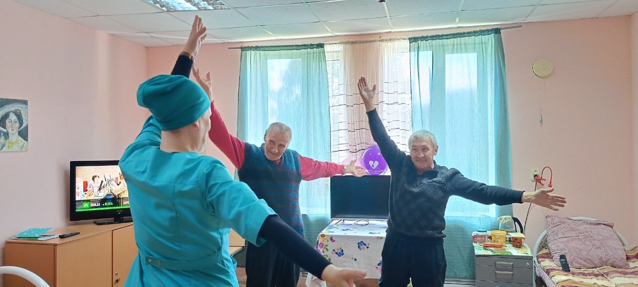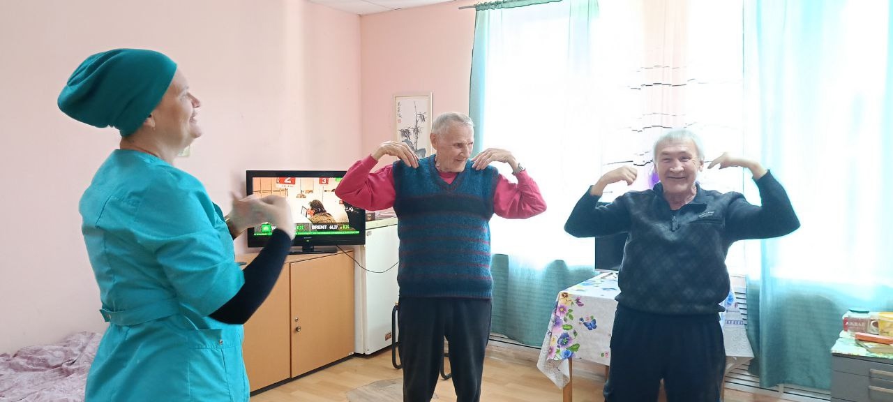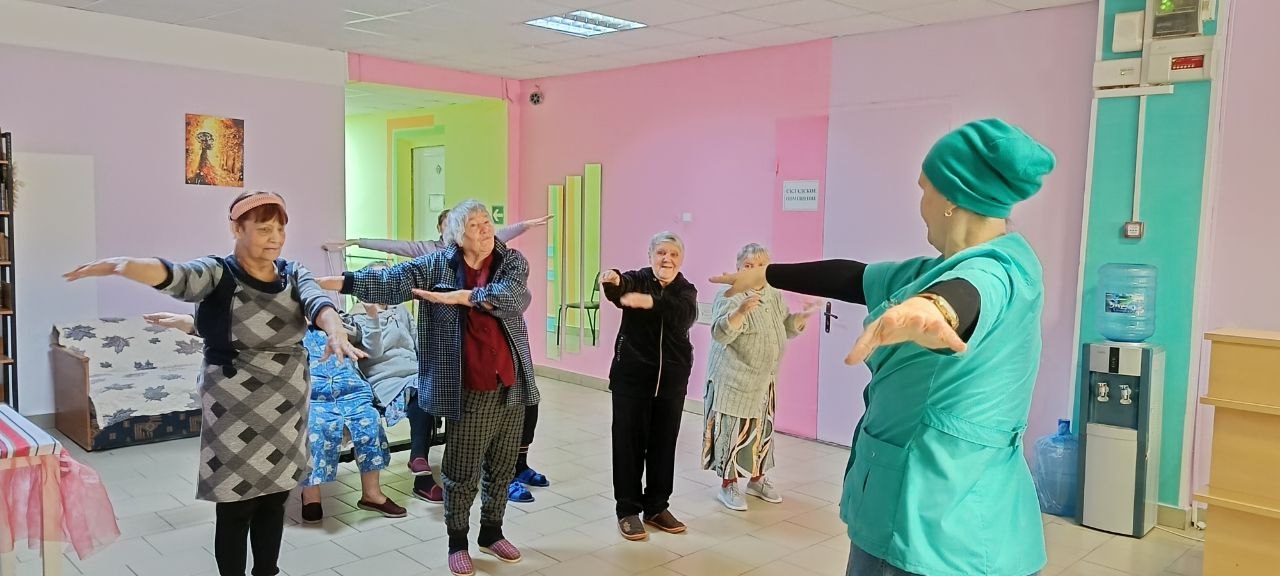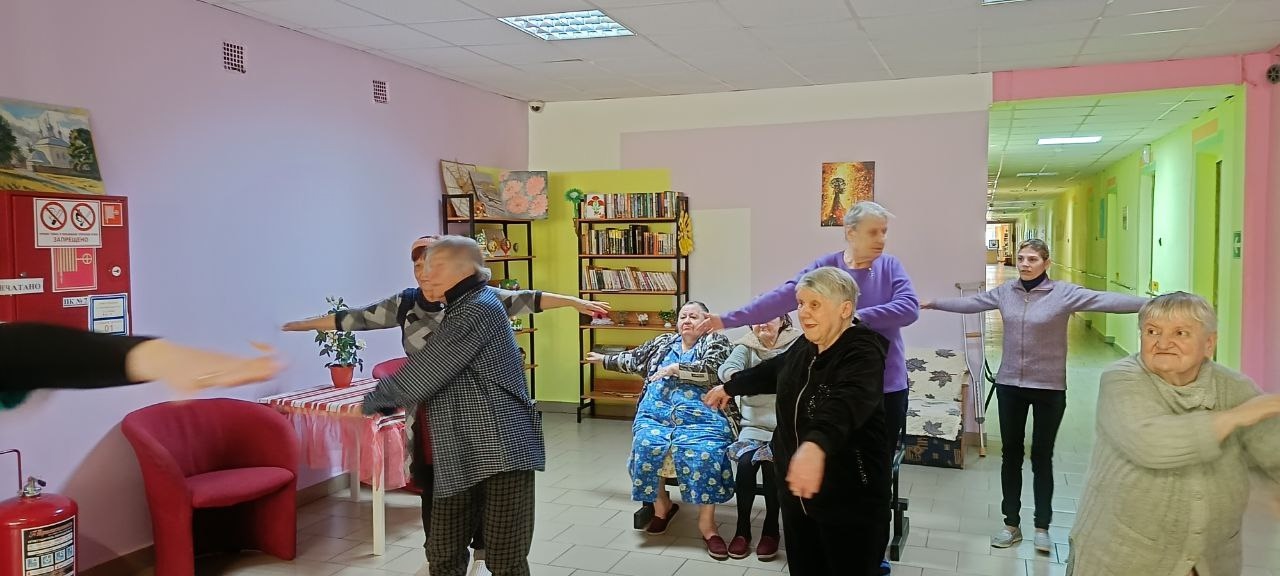 Утро в Вяземском доме-интернате начинается с разминки, чтобы зарядиться хорошим настроением и бодростью на целый день. А хорошее настроение – это основа желания жить, открывать для себя что-то новое и интересное.