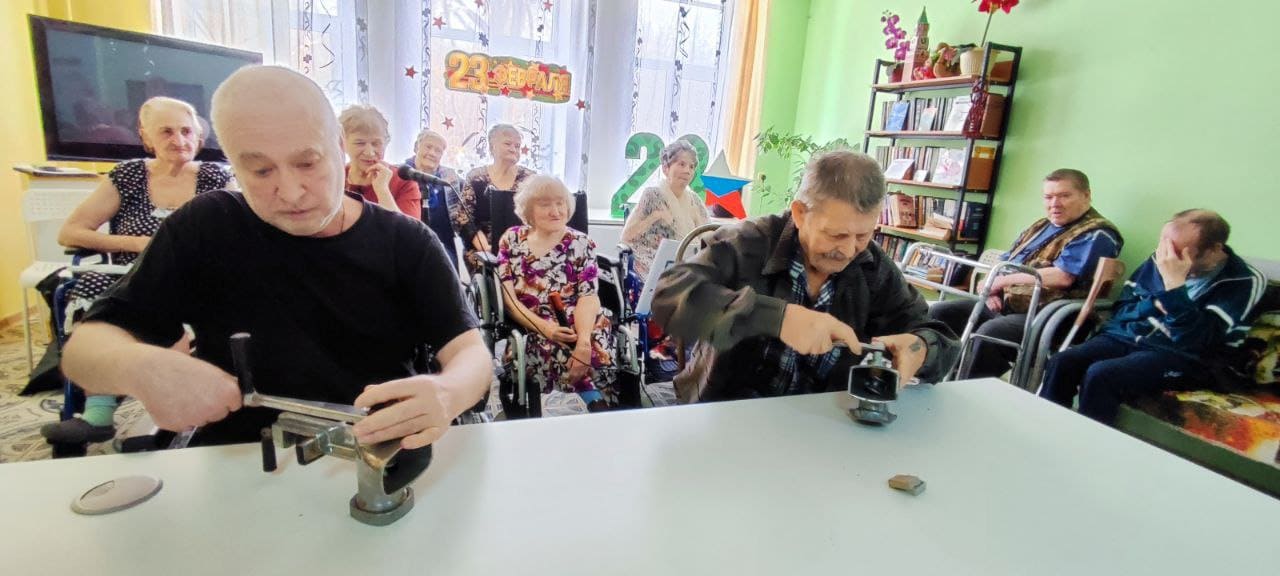 В канун замечательного праздника в Вяземском ДИПИ прошло литературно-музыкальное мероприятие. Стихи и песни о стойкости, мужестве, чести и, конечно, слова поздравления и пожелания здоровья, мирного неба, силы духа и успехов во всех начинаниях прозвучали в адрес мужской половины жителей и сотрудников дома-интерната. А настоящий мужчина соберет «рюкзак солдата», назовет правильно звание, и сможет собрать и разобрать не только автомат Калашникова, но и мясорубку.